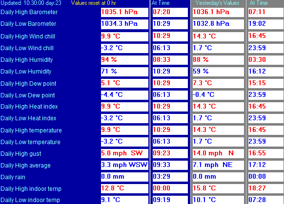 | Maximum Temperature (since 0 hour) | 3.3 at: 09:29 | Minimum Temperature (since 0 hour) | -3.2 at: 06:13 |
